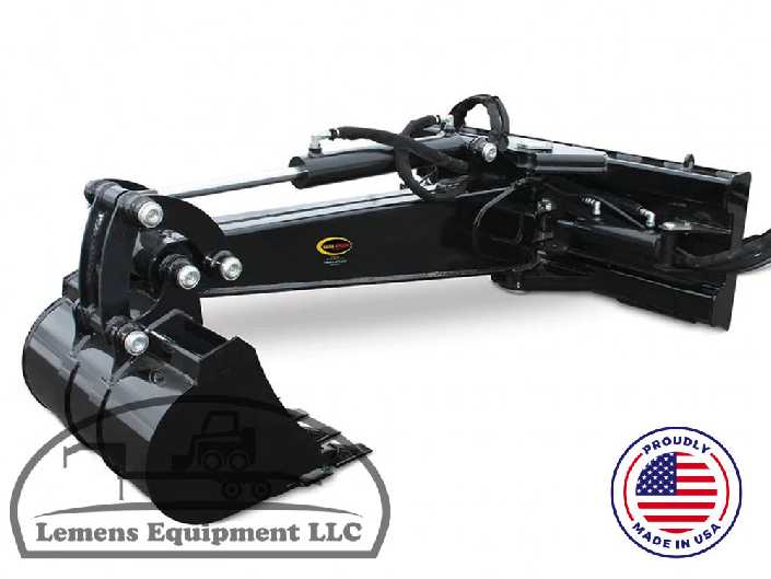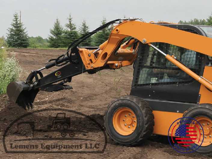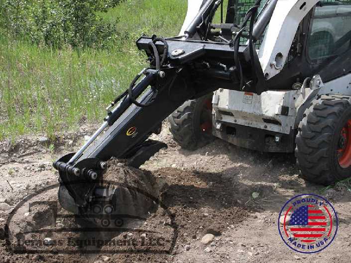 Dig deep with the Digging Backhoe. This skid steer digger backhoe reaches 6 feet deep with a single arm and hydraulically controlled bucket. Use it for trenching or other productive digging work. Includes hydraulic side-to-side swing operation.