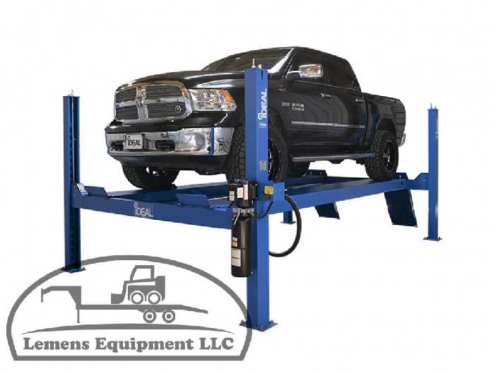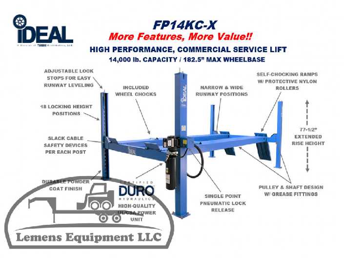 The iDEAL FP14KC-X 14,000 lb. four post commercial service lift is a high-performance closed front, cable pull vehicle lift designed for cars, SUVs, vans and trucks. The FP14KC-X service lift includes the latest in design and safety features including, narrow & wide runway mount positions, extended rise height for greater undercarriage vehicle access, concealed hydraulic / mechanical cable lift system with slack cable safety devices and durable pulley & shaft design incorporating convenient grease fittings to extended life of the lift. Easy lift operation is provided with single point pneumatic lock release & high quality DURO power unit, while providing additional safety & protection with self-chocking ramps and included wheel stops. The iDEAL FP14KC-X modular design provides the flexibility to extend the runways for servicing longer vehicles, while also providing the ability to convert into a high-quality alignment lift quickly and easily! The standard provided powder coat finish, 20" wide runways, adjustable lock stops for easy runway leveling and optional power unit mount positions complete the package for a premium, high quality service lift, all at an unmatched value!