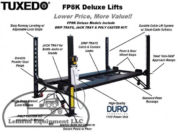 The Tuxedo FP8K-DX 8,000 lb. deluxe four post lift is a durable high quality, cable pull vehicle lift, designed for storing, inspecting & servicing most cars, suv’s, vans & trucks, while also providing space-saving parking solutions for most residential garages & shops.