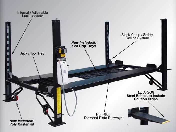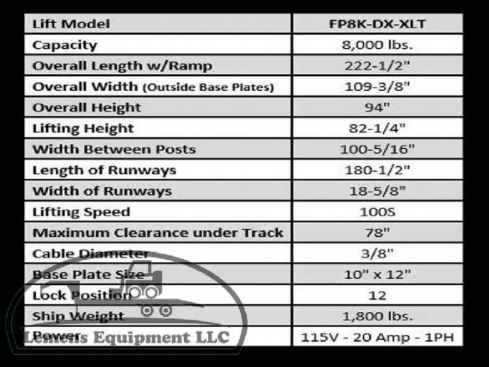 The FP8K deluxe model includes drip trays, a jack tray & a poly caster kit for moving the lift around on wheels. It incorporates the latest in design & safety features with reliable hydraulic operation, durable mechanical cable lift system with a slack-cable safety device and cable pulley shaft design with grease fittings to assist extending the life of the lift. The FP8K lift comes in two model sizes, the FP8K-DX ‘standard’ for small to mid-sized vehicles, while the FP8K-DX-XLT ‘extended’ provides additional lift height, width & length for larger vehicles. Easy lift operation is provided with single point mechanical lock release and a 115V electric / hydraulic high-quality power unit, while also having the option either to anchor the posts to the floor or keep mobile, using the poly caster kit. With durable powder coat finish, wide diamond plate runways, front & rear wheel stops & adjustable lock stops for easy runway leveling, the FP8K lifts are economically priced with all the features, all for an unmatched value!
