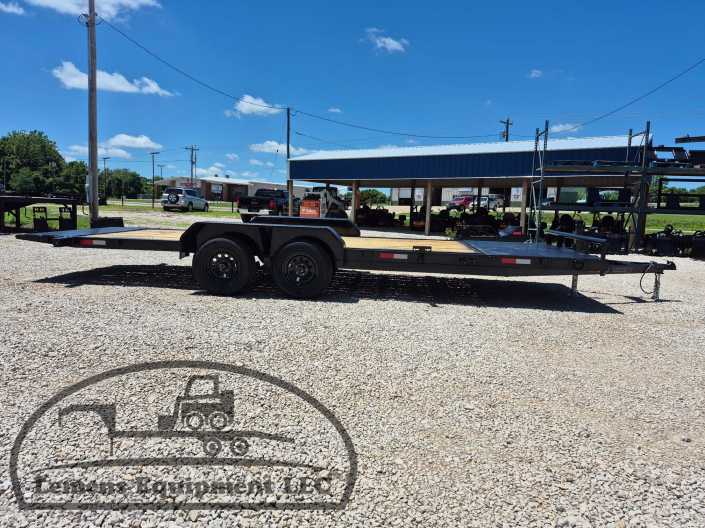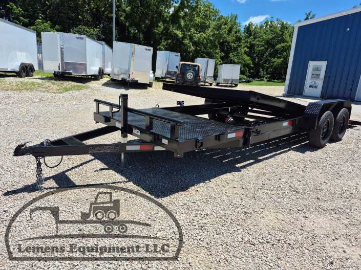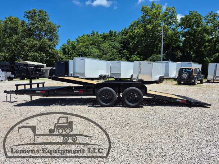 This is a tandem axle 7k bumper pull split tilt trailer in black color. It is 22ft long and it comes with a hydraulic cushion cylinder. It would work good to haul a car, truck, skid steer, track loader, mini ex, tractor, fork lift, and scissor lift. It is a good deal and the price is cheap. See more details below, thanks!