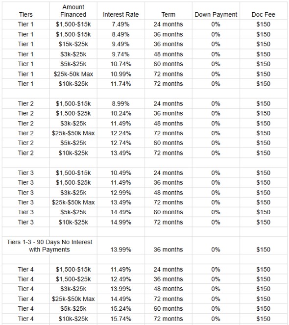 TSF works with trusted lenders with flexible terms and no early payoff penalties or hidden fees. Use the link below to complete the Service Form and a representative will reach out to guide you through their easy financing process. It helps to get pre-approved from home to save time, as it can take up to 3 hours to process it. There is a $3500 loan minimum with TSF.