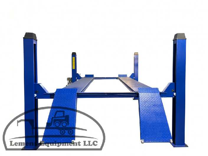 Cable driven four post lift provides 12,000 lb. lifting capacity. No power beam; Cylinder stowed under single piece diamond plate track. Simple, lever release system and redundant safety locks.